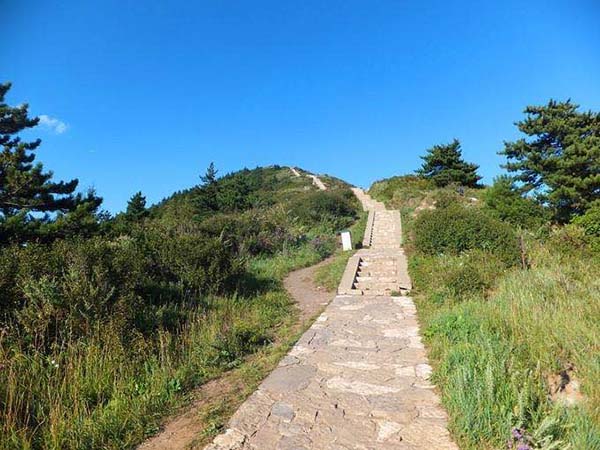 參觀完最后的一個廟,已是中午,天氣越來越熱,額頭上的汗珠一滴一滴往下流,衣服也緊緊貼在了背上,心想應(yīng)該快到了吧,可哪知道才走了三分之一。看著通往天峰嶺上百個臺階很想休息一會,突然發(fā)現(xiàn)和我們同行的同事女兒,她才6歲,小臉紅撲撲的還意志堅定的一直往上爬,我也不能落后。打消了休息的念頭,一步一步地抬起沉重的腳步氣喘吁吁的往最高峰走起。